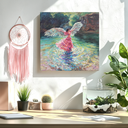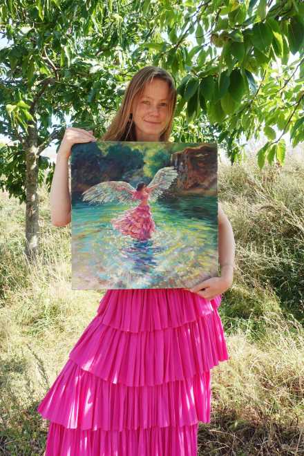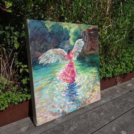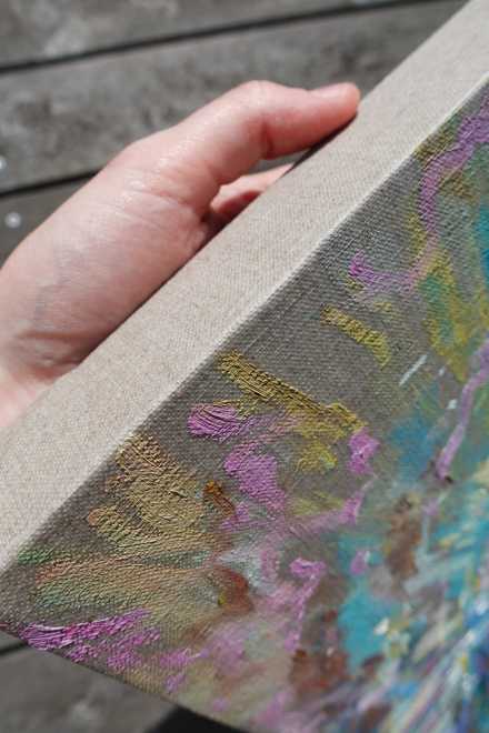 It is an oil painting on high quality linen canvas with a wide frame. The canvas has been primed with clear gesso, allowing the natural texture of the linen to show through. This texture is visible not only on the sides of the frame, but also on the artwork itself, where it adds a beautiful neutral color.