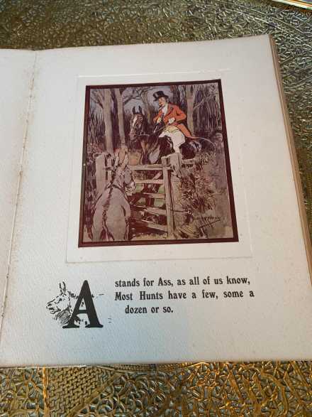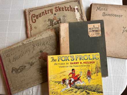 A variety of old hunting books including Country Sketches by Finch Mason, The Fox's Frolic hardback with verses by Sir Francis Burnand and pictures by Harry B. Neilson, A Hunting Alphabet by G D Armour, More Bandobast by Snaffles, Leaves from a Hunting Journal. All well read and much loved. Would make great christmas presents for young and old.