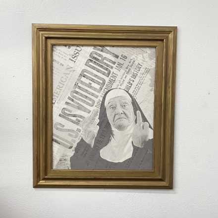 Gold Framed Newspaper Nun Cursing Artwork 31"H x 28"L