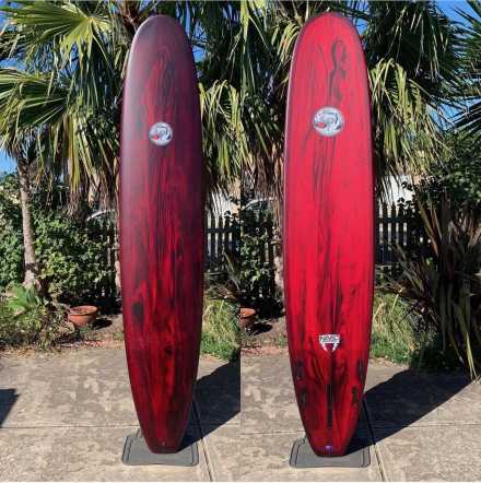The Surfbord is fibreglassed in an awesome charcoal and fire red resin tint and fitted with FCS Fins.