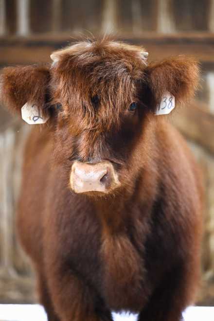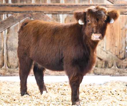 Scarlet is a beautiful red frosted Highland heifer with compact, correct structure and strong maternal lines. She is the result of an embryo pairing from Circle AM’s elite embryo program. Both parents are red frosted and midsize, which makes Scarlet a standout option for a breeding program looking to maintain quality while incorporating striking color. Scarlet just started getting her frosting in , so we're expecting her to get a lot more!