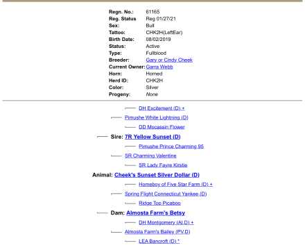 • Sire: Cheek’s Sunset Silver Dollar – 45” Silver AHCA Registered Highland Bull