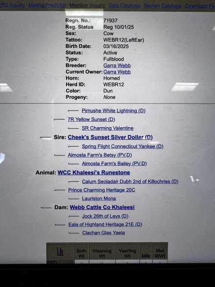 • Dam: Webb Cattle Co Khaleesi – 44" Dun Highland Heifer