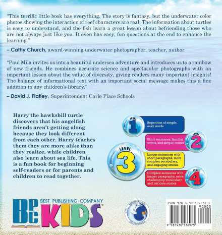 "Harry Hawksbill Helps His Friends" is the first book in the series, "Harry Hawksbill's Sea Turtle Adventures!" Harry the hawksbill turtle discovers that his angelfish friends aren't getting along because they look different from each other. Harry teaches them they are more alike than they realize, while children also learn about sea life. This is a fun book for beginning self-readers or for parents and children to read together. Vibrant photos set this book apart from other children's books. Author and diver Paul Mila uses his vivid underwater photos to bring this story to life. Recommended for readers age 4-8.