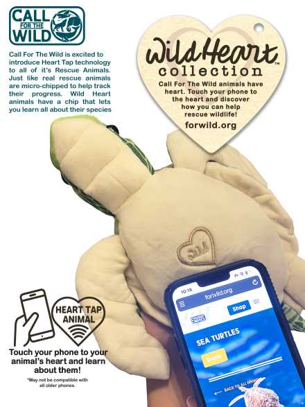 Each turtle includes an Animal Identification Card with fun facts and care tips to help you get to know your new friend. Plus, the turtle’s embroidered “wild heart” is more than just a sweet detail — hold your phone near it and tap the link to visit the Call For The Wild Sea Turtle Education Page and learn all about sea turtles and the organizations who head up real rescue efforts.