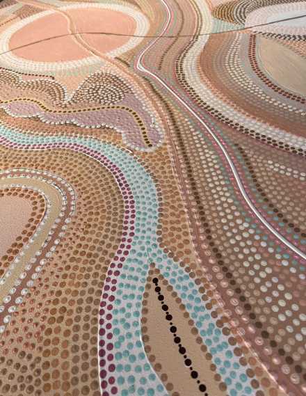 Own a stunning original canvas painting, beautifully framed and created by renowned local Aboriginal artist, Lois Sallustio. This one-of-a-kind piece is a celebration of culture, storytelling, and connection to Country, capturing the essence of Aboriginal heritage through vibrant colours and intricate patterns.