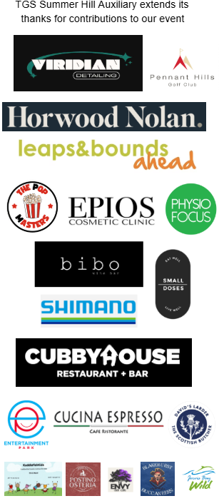 The TGS Summer Hill Auxiliary and TGS P&F committee would like to extend their thanks to the generous businesses who donated towards Trivia 2025. Contributors as of 12/03/2025- Michelle and Belinda Civitarese, Viridian Detailing, Dr Michael Kinchington, Horwood Nolan Family, Popcorn Masters, Leaps & Bounds Ahead Dragon Boating, Physio Focus Sutherland Shire, Shimano, Small Doses Cafe@ TheHub RNSH, CubbyHouse, Epios Cosmetic Clinic, Colliard Wines, Pennant Hills Golf Club, Bibo Wine Bar, The Entertainment Park, OTU, Cucina Espresso Cafe, David's Larder, Neetal Artistry, TreeTops Nowra, Jervis Bay Wild Cruises, The Hon. Chris Minns, Seeto Family, Mrs C. Summers, Postino Osteria, Blakehurst Buccaneers Lawn Bowling Club, Envy Cafe, KuddleFish Kids and more.