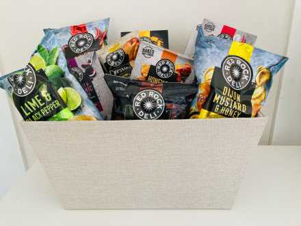 Red Rock Deli hamper. Includes 5x Red Rock Deli crackers, 8x Red Rock Deli potato chips and 1 x Red Rock Deli Crostini.
