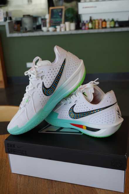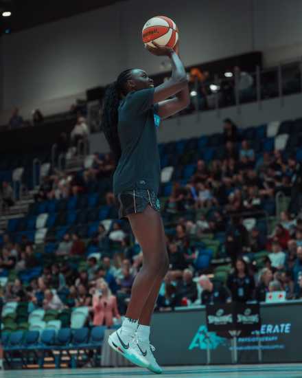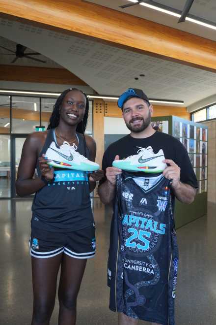 The shoes worn by Nyadiew Puoch during the 25th October 2025 WNBL Indigenous Round match up of the UC Capitals v Townsville Fire at AIS Arena in Canberra. These shoes feature custom artwork by Richard Allan, proud Ngunnawal man and the artist behind the UC Capitals' last 3 Indigenous round uniforms.