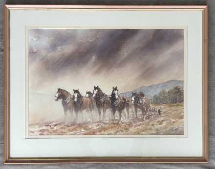 This framed classic Australiana style watercolour depicts a powerful rural scene where six strong horses pull a plough across a field. A farmer walks behind them, guiding the heavy work as dark, stormy clouds gather above. The atmosphere captures the urgency of working the land before the storm breaks, with earthy tones and mist creating a dramatic and atmospheric mood.