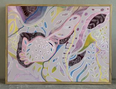 This piece captures the quiet mystery of a seed resting in the earth — a small vessel of life held in layers of soil, roots, and unseen energy. The flowing lines and soft colours suggest movement. Surrounding patterns echo the cycles of nature — roots spreading, water weaving, the beauty of colour normally seen above ground is seen in the soil beneath. It is a reminder that life begins in hidden places, that transformation often starts beneath the surface.
