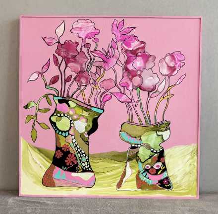 This artwork feels joyful and full of character. The vases are irregular and unique, suggesting the idea that beauty doesn’t need perfection — it thrives through individuality and texture. The contrast between the earthy greens and the bright pink background, create nature’s quiet growth and its vibrant bloom.