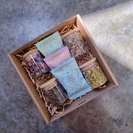 Afternoon Tea Bundle with 4 assorted loose leaf tea in refillable glass jars and 3 assorted Loco Love handcrafted chocolates. Share with someone special, or take some time to treat yourself.
